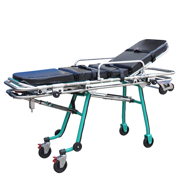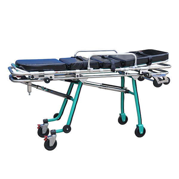 擔(dān)架面可分離,有鎖定裝置??勘辰嵌扔蓺鈴椈烧{(diào)節(jié),范圍0-65°??煞D(zhuǎn)護(hù)欄在轉(zhuǎn)移過(guò)程中保護(hù)病人。折腿機(jī)構(gòu)由右把手控制,僅需一人就可把擔(dān)架推上救護(hù)車(chē),當(dāng)擔(dān)架在救護(hù)車(chē)上時(shí),可用固定裝置鎖住,本擔(dān)架由高強(qiáng)度鋁合金材料構(gòu)成,φ150mm,125mm寬面橡膠輪,主要用于救護(hù)車(chē),醫(yī)院,急救中心。