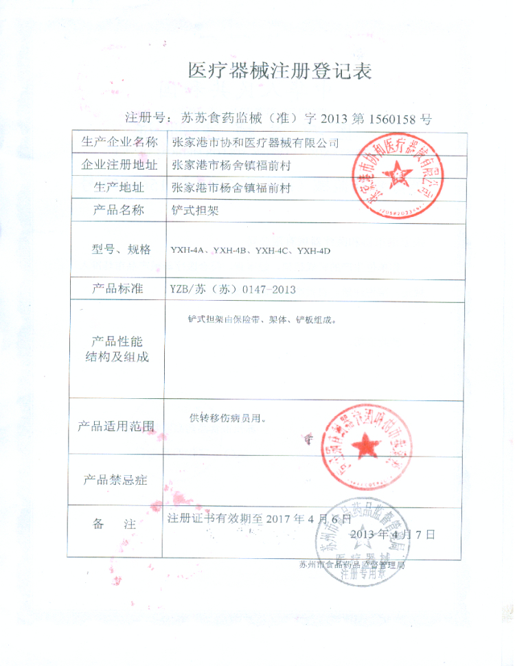 鏟式擔(dān)架注冊登記表